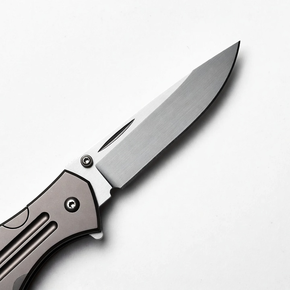 A sleek tactical folding knife with a sharp silver blade is open and angled on a white background. The handle features a dark gray metallic finish with textured grooves and pivot points. The blade has a pointed tip and clean edges.