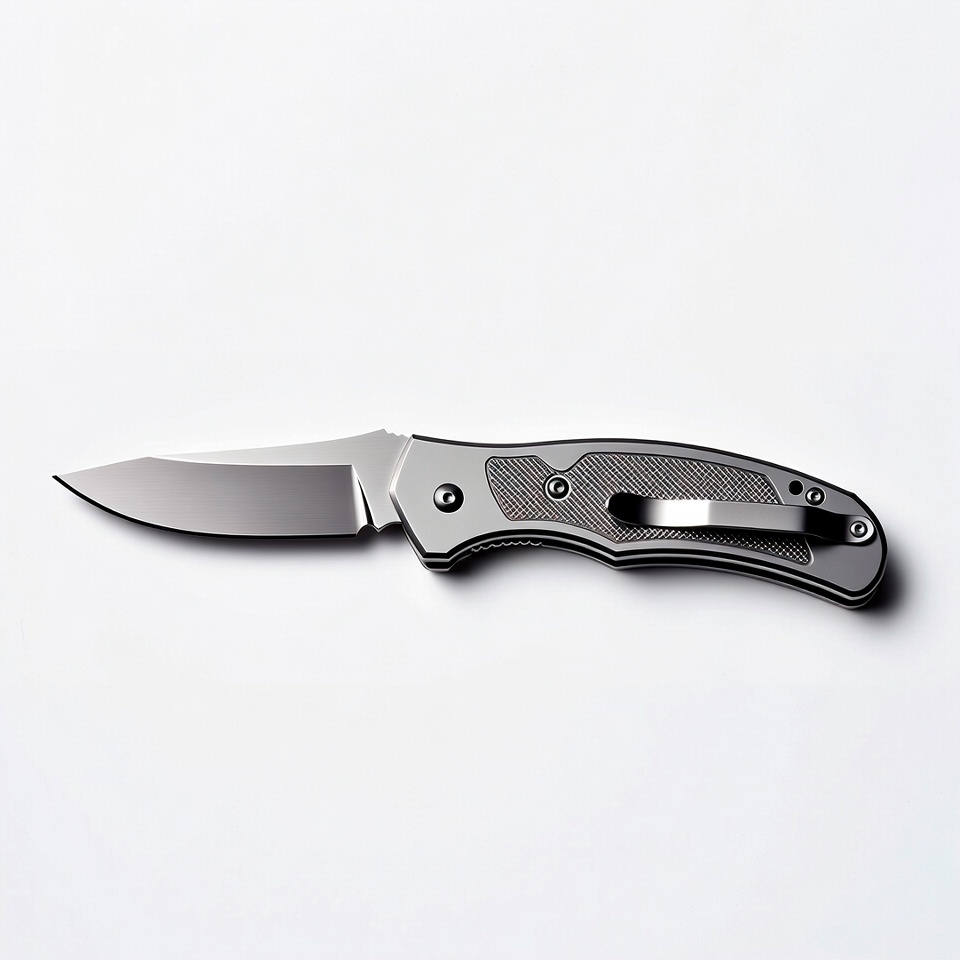 EDC knife, black handle, folding knife, isolated background, knife handle, metal knife, open knife, outdoor knife, pocket clip, sharp blade, silver blade, survival knife, tactical knife, utility knife, pocket knife