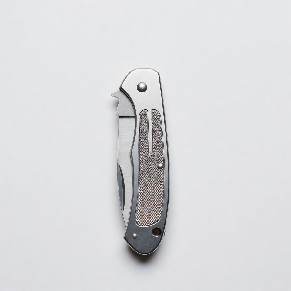 EDC knife, flipper knife, folding knife, isolated background, knife handle, liner lock, metal knife, sharp blade, silver knife, straight blade, tactical knife, textured grip, white background, pocket knife