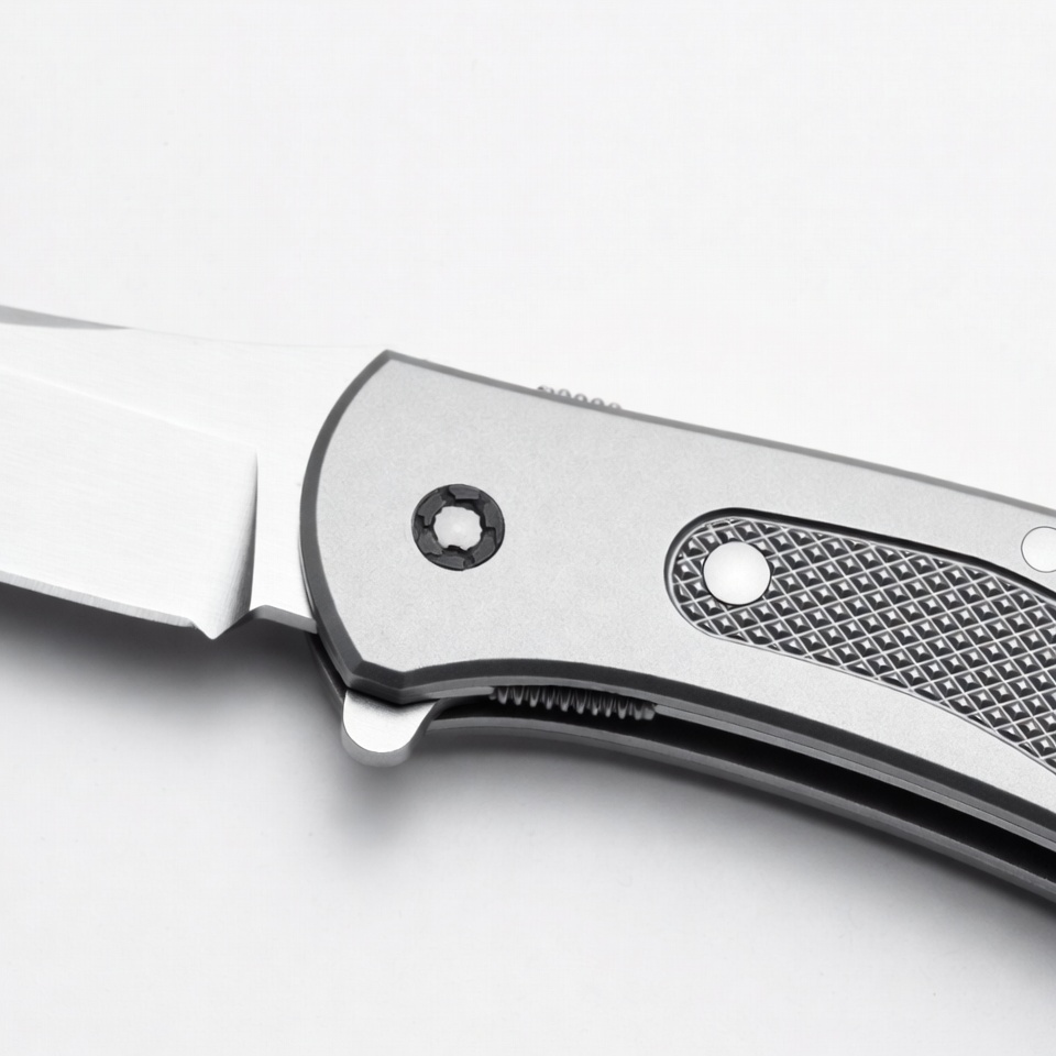 EDC knife, compact knife, flipper knife, folding knife, gray knife, knife handle, liner lock, metal knife, open knife, outdoor knife, sharp blade, silver blade, survival knife, tactical knife, textured handle, thumb stud, tool, weapon, white background, pocket knife