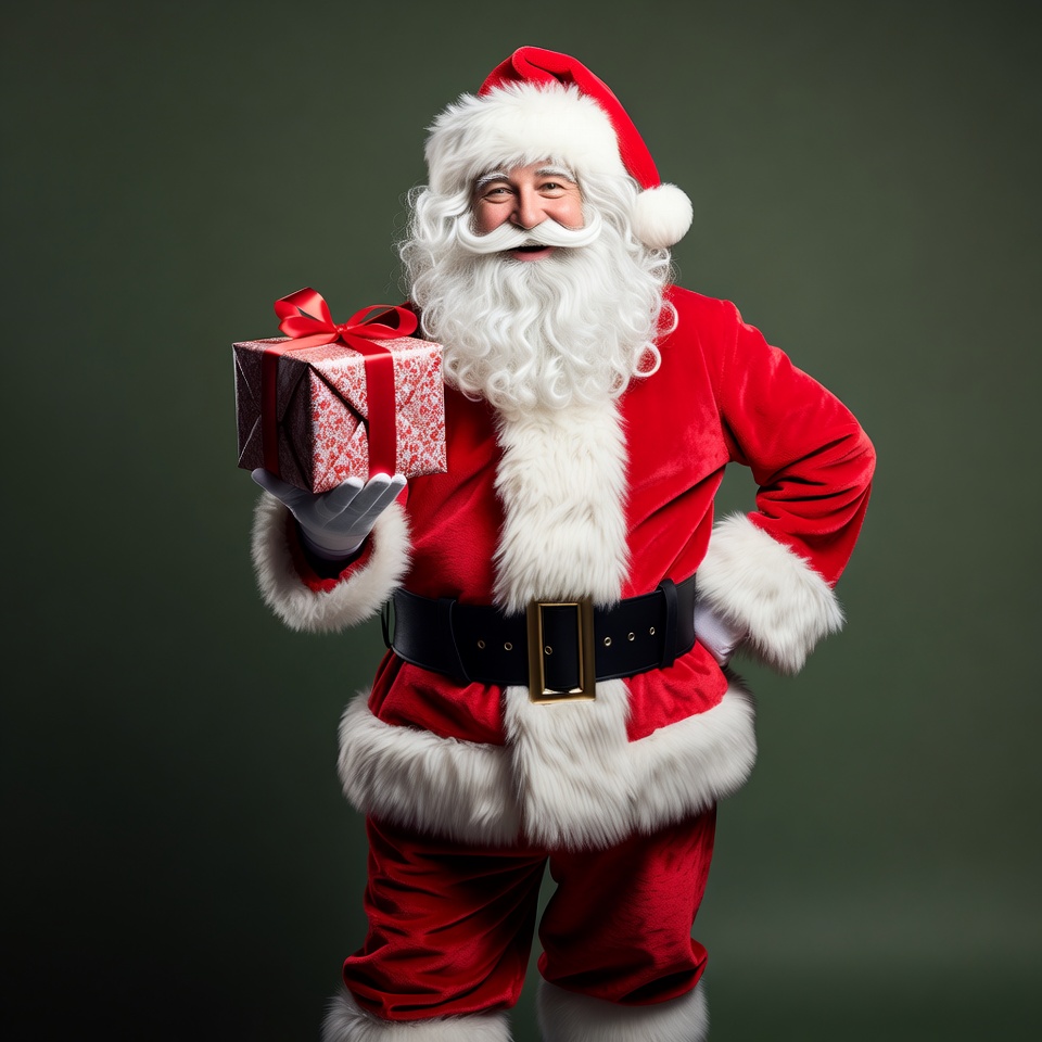A jolly Santa Claus in a red velvet suit with white fur trim stands confidently against a green background. He has a long white beard, wears a red hat with white pom-pom, and black belt with gold buckle. In his white-gloved hand, he holds a red wrapped gift box topped with a large bow.