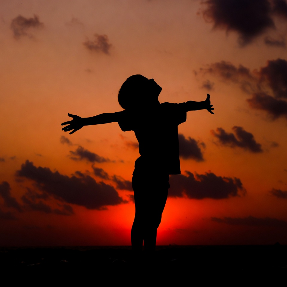 A silhouette of a young boy stands with arms outstretched wide against a vibrant orange sunset sky. Dark clouds frame the scene, and he wears a short-sleeved shirt and shorts. The image captures him from behind on a flat horizon.