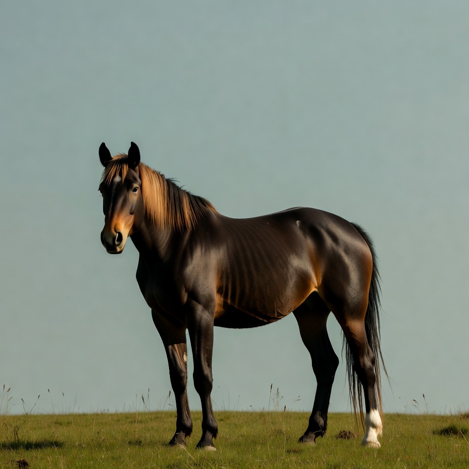 animal, bay horse, black mane, blue sky, equine, farm animal, glossy coat, grass, grassy hill, green field, mammal, nature, outdoors, side view, sky, standing horse, strong legs, tail, white socks, horse