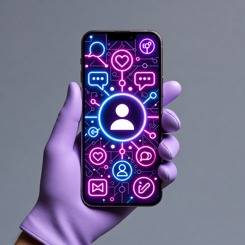 A gloved purple hand holds a smartphone with glowing neon social media icons like hearts, chat bubbles, and profile symbols surrounding the screen. The phone features a central glowing profile avatar connected by digital lines to various app icons on a dark screen. The background is plain gray, emphasizing the vibrant neon effects.