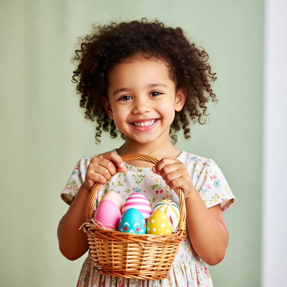 A young African-American girl with curly black hair smiles happily while holding a woven basket filled with colorful Easter eggs. She wears a floral-patterned dress and stands against a light green background. The eggs in the basket feature pink, blue, yellow, and striped designs.