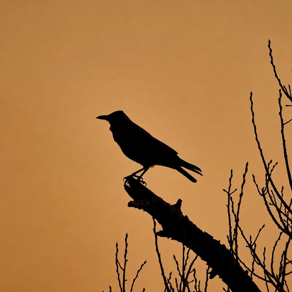 avian, backlit, bird, black bird, branch, corvid, dusk, isolated background, nature, orange sky, perched, silhouette, sunset, twigs, wildlife, crow