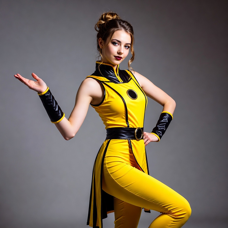 A young woman with brown hair in a bun poses dynamically on a gray background. She wears a shiny yellow and black superhero outfit with a high collar, black arm guards, belt, and side slits. Her hand is extended in a presenting gesture while standing confidently.