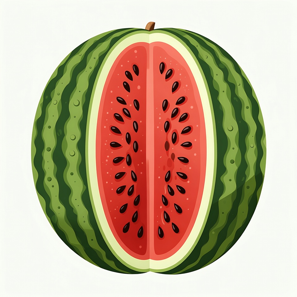 A vibrant illustration of a whole watermelon sliced open in half. The green rind features dark stripes and water droplets, revealing bright red flesh filled with black seeds. It is centered on a white isolated background.