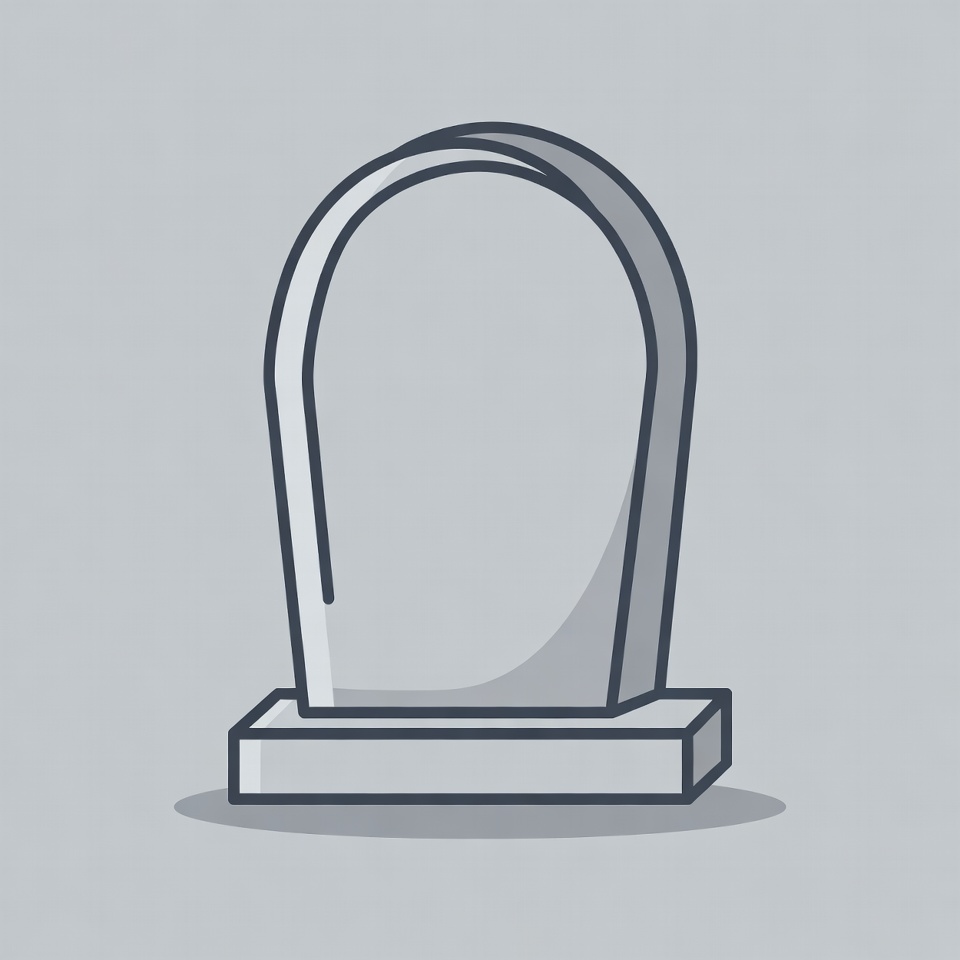 A simple line art illustration of a gravestone with a curved top and rectangular base. The tombstone is depicted in shades of gray with subtle shadows for depth. It stands isolated against a solid gray background.