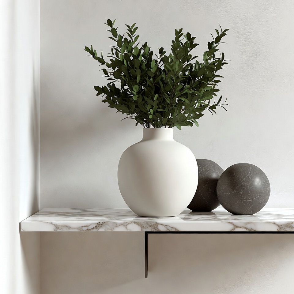 A white ceramic vase filled with lush green branches sits on a white marble shelf. Two textured gray spheres are placed beside the vase. The setup features a minimalist design against a plain white background.