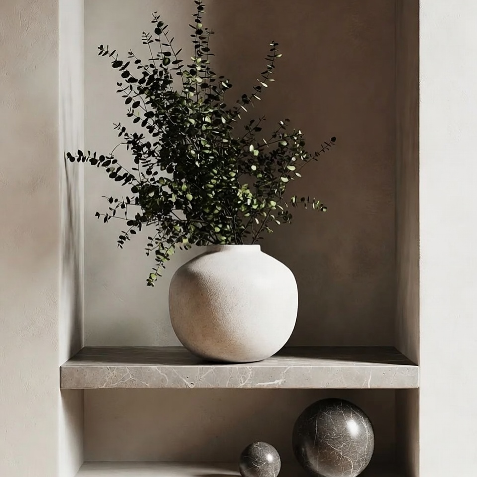 beige wall, branch, decor, foliage, gray orb, green leaves, home decor, interior, marble shelf, minimalist, neutral tones, niche, ornament, plant, shelf, sphere, still life, textured vase, vase, white vase, eucalyptus