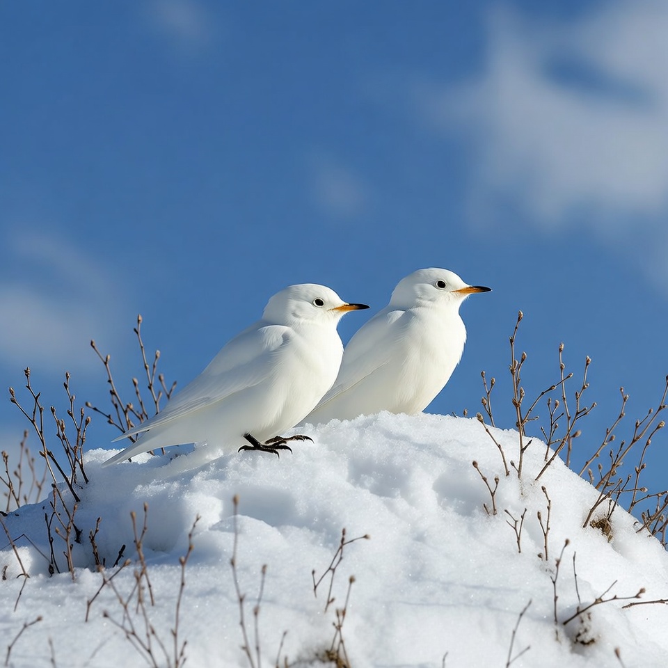 Two white snow buntings with black legs stand closely together on a snow-covered hill. They perch among sparse brown twigs against a bright blue cloudy sky. Their feathers are pristine white with small orange bills.