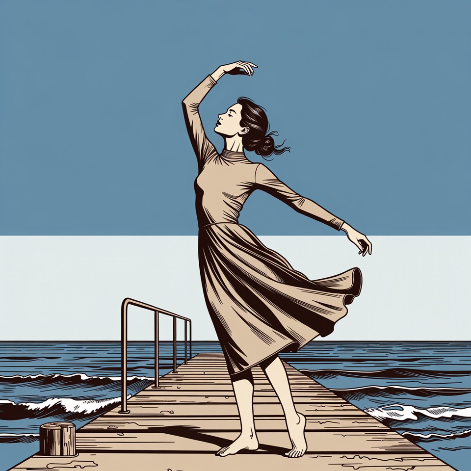 An illustration of a woman with dark hair in a bun performs a graceful dance pose on a wooden pier extending over the ocean. She wears a long-sleeved beige dress with a flowing skirt billowing in the wind and stands barefoot. The scene features a blue sky, crashing waves, and a metal railing beside the pier.