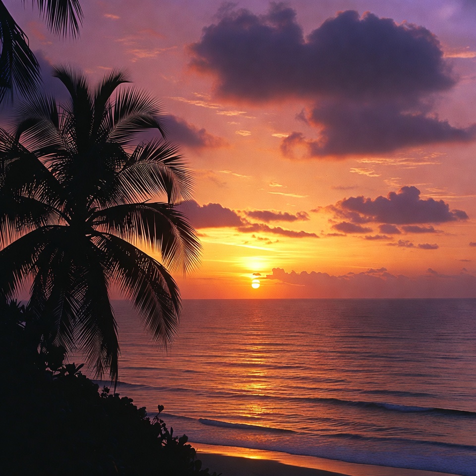 Silhouetted palm trees stand in the foreground against a vibrant orange and purple sunset over the ocean. Gentle waves lap at the sandy beach below, with scattered clouds reflecting the warm sunset colors. The scene captures a serene tropical coastline at dusk.