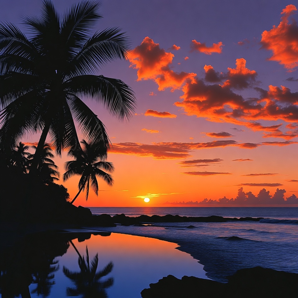 Silhouetted palm trees stand along a rocky beach during a vibrant sunset with orange and purple skies. The sun dips toward the ocean horizon, reflecting in shallow turquoise pools amid the sand and rocks. Clouds glow in hues of red and orange above the calm sea.