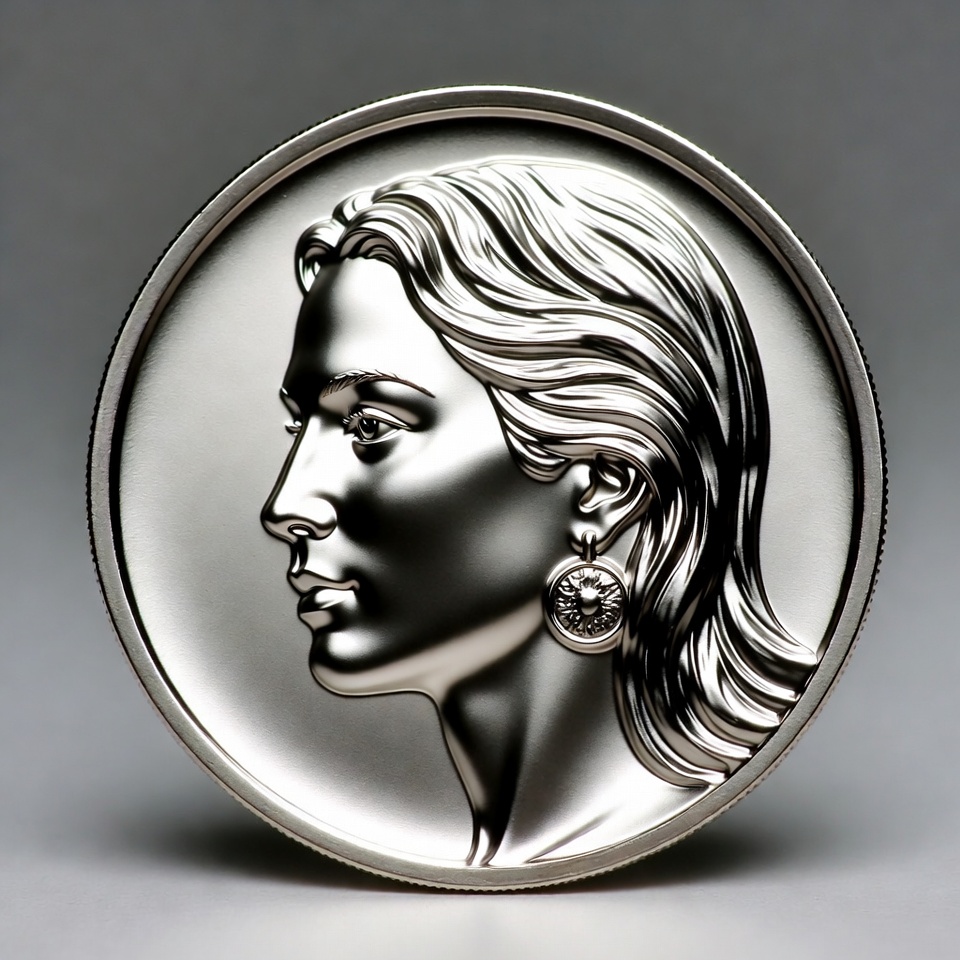 A silver coin features a detailed profile of a woman facing left. She has long wavy hair, wears large hoop earrings, and her face is rendered in a realistic metallic style. The design is centered on a circular coin with a smooth edge.