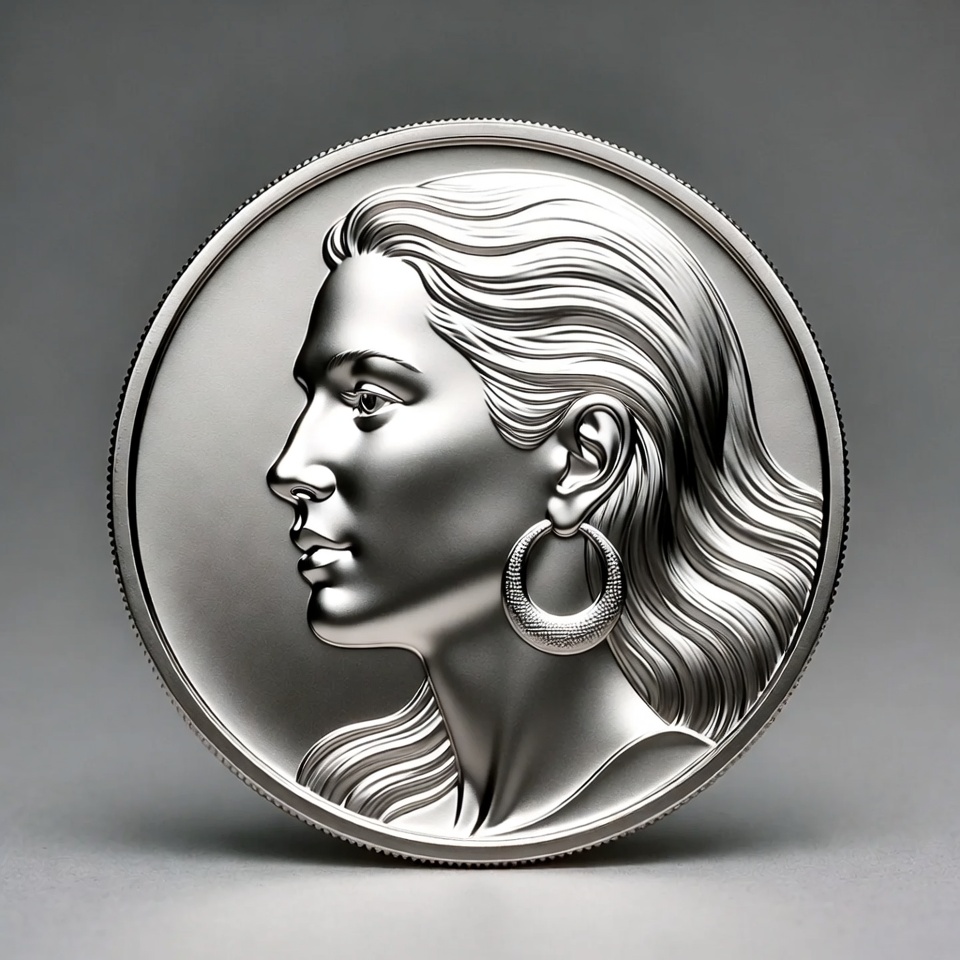 A highly detailed silver coin features a profile view of a woman with long wavy hair and large hoop earrings. The metallic surface has a realistic engraved appearance with smooth shading and highlights. She faces left against a plain circular background.