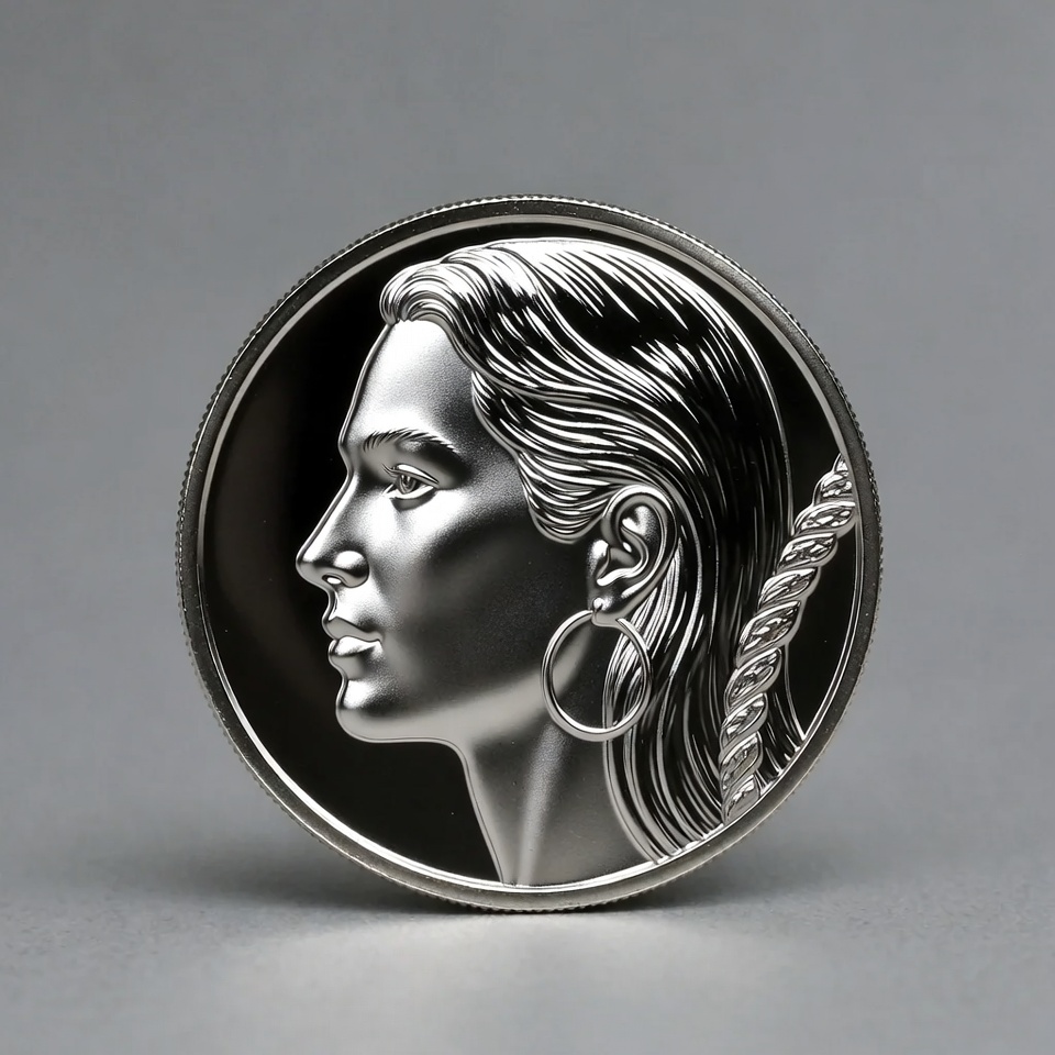 A silver coin features a detailed profile of a woman with long wavy hair and large hoop earrings. She faces left in a classical style against a black background. The coin's metallic surface reflects light, highlighting the engraved facial features.