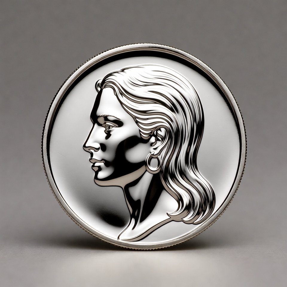 A shiny silver coin features a detailed profile of a woman facing left. She has long flowing blonde hair and wears large hoop earrings. The coin has a smooth metallic surface with a reeded edge.