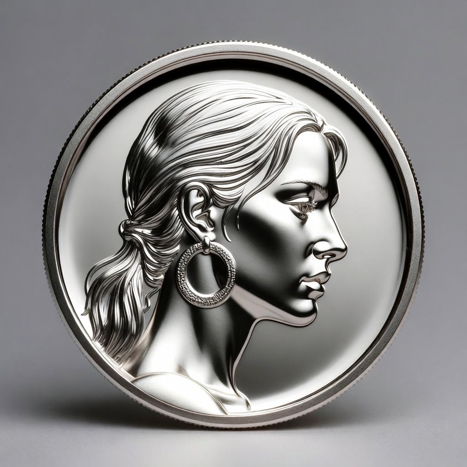 3D render, White, bust, coin, coin design, currency, earring, elegant woman, face, female face, hair, hoop earrings, illustration, jewelry, metallic, ponytail, profile view, silver, woman, woman profile, silver coin