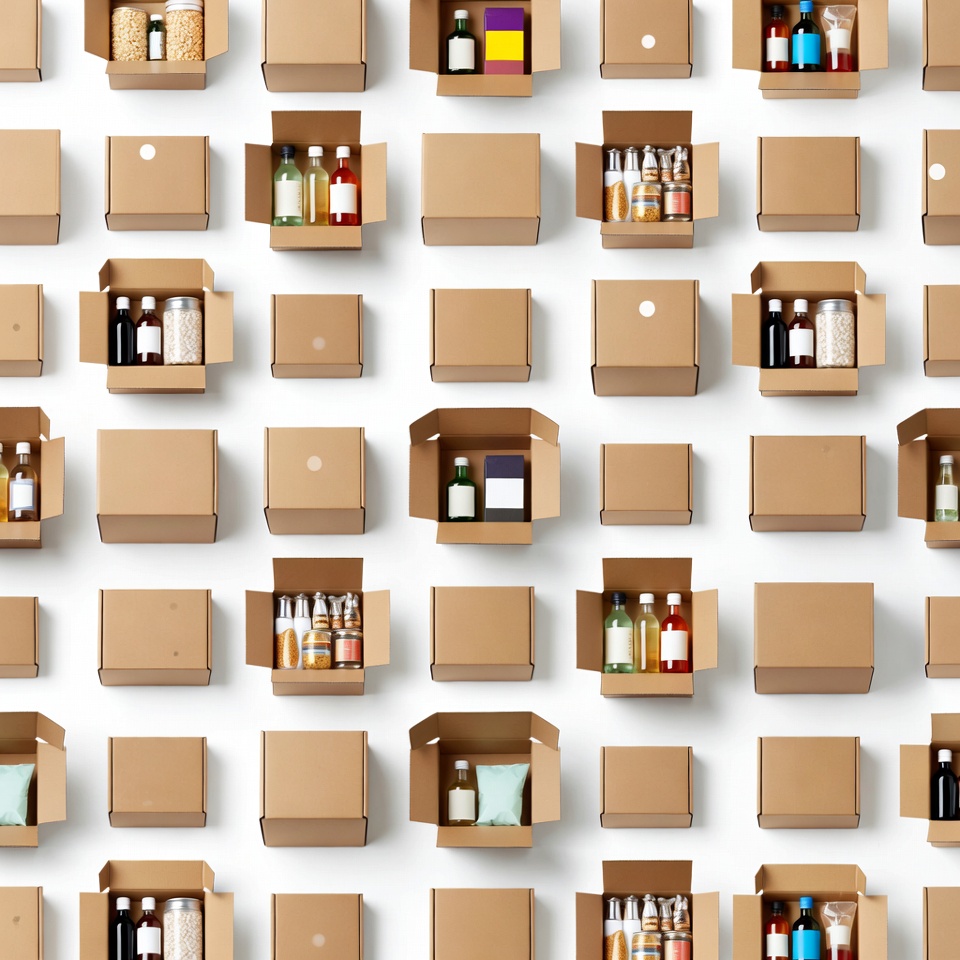 assorted products, bottles, boxes grid, brown boxes, containers, goods, jars, liquids, open boxes, packaging, powders, products, retail packaging, shipping boxes, storage boxes, white background, cardboard boxes