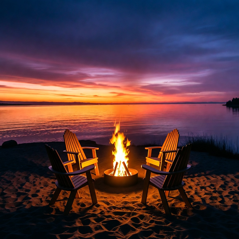 Campfire with Adirondack Chairs by Lake Sunset