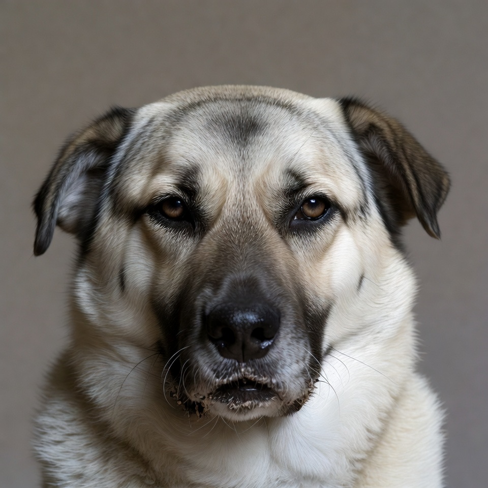 A Kangal dog with light brown and black fur stares directly at the camera. Its head is centered against a plain gray background, highlighting its dark eyes, black nose, and slightly open mouth with visible whiskers. The dog's ears are perked up and its fur appears fluffy around the neck.