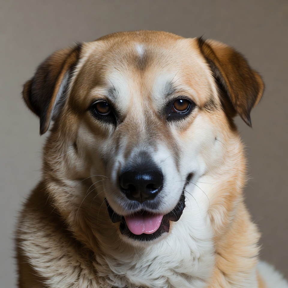 A fawn-colored German Shepherd dog with a white muzzle stares directly at the camera with dark eyes. Its mouth is open in a happy smile, revealing its tongue and white teeth. The dog has fluffy fur and is photographed against a plain beige background.
