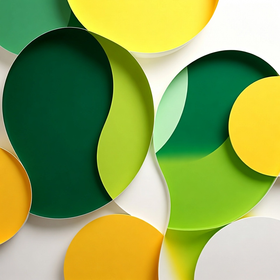 Abstract composition of overlapping semi-transparent paper circles in vibrant green, yellow, mint, and white. The circles create layered cut-out effects against a white background. Smooth curves and varying sizes form a dynamic geometric pattern.