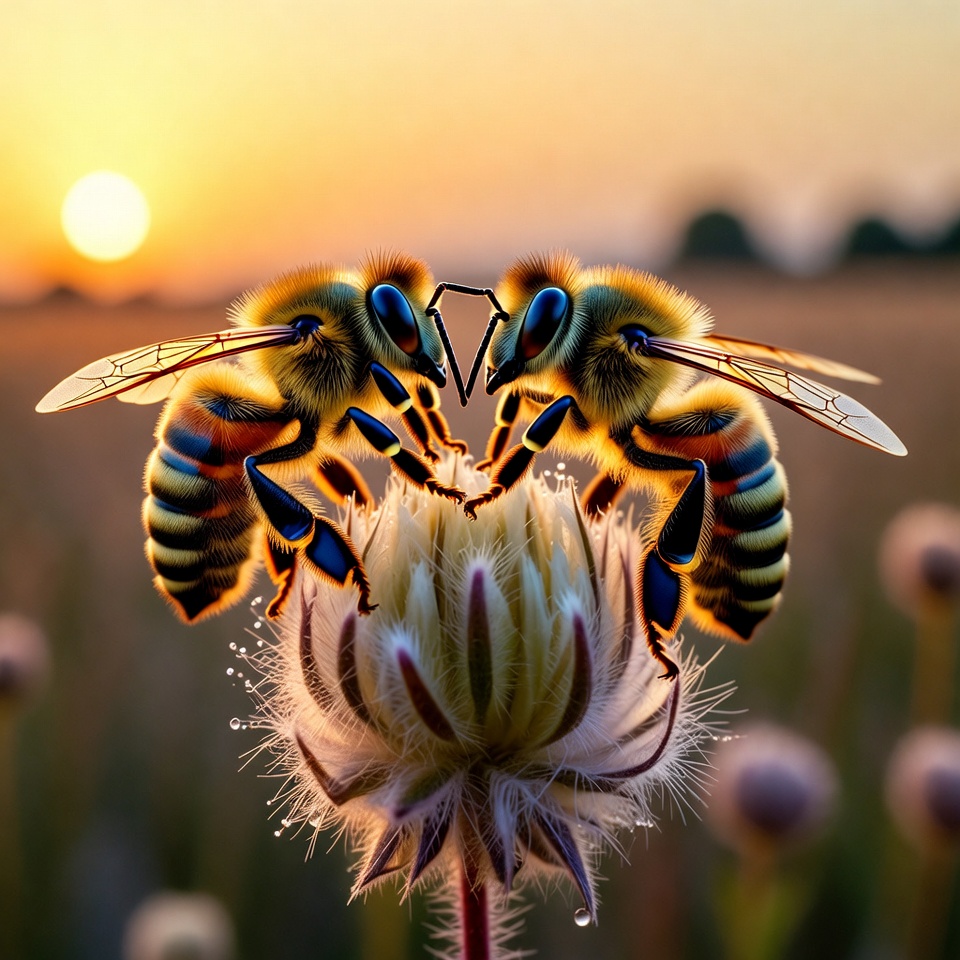 Two honeybees with golden fur are perched on a white thistle flower, pollinating it during golden hour. The sun sets in the background, casting warm orange light over the field of flowers. Dew drops glisten on the flower petals.