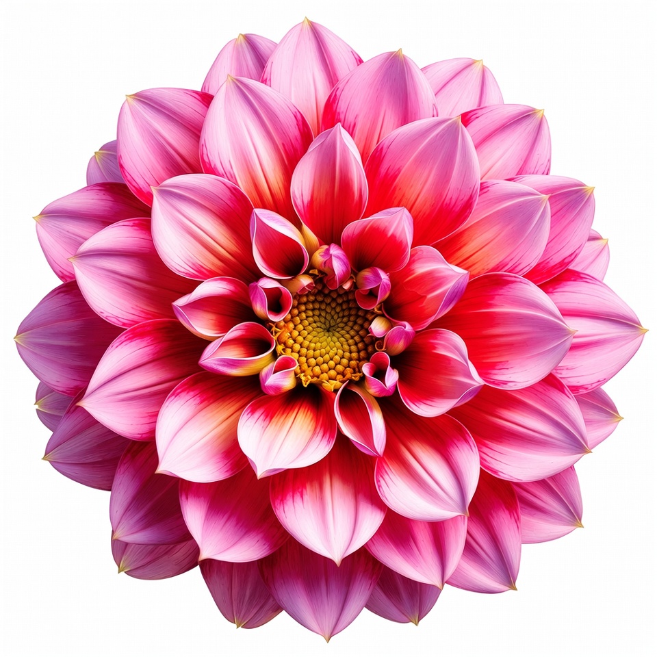 bloom, dahlia bloom, floral, flower closeup, garden flower, isolated flower, layered petals, petals, pink flower, pink petals, red flower, vibrant flower, white background, yellow center, dahlia flower