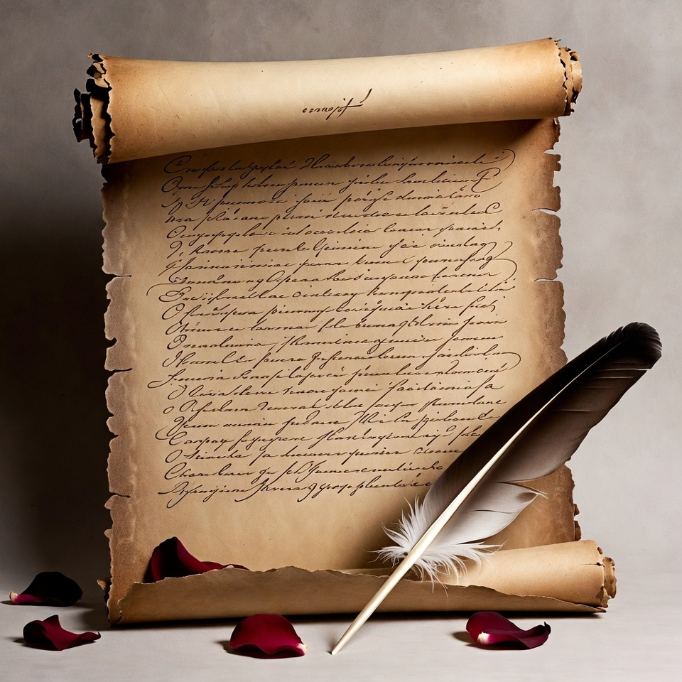 Latin text, aged parchment, beige background, calligraphy, cursive writing, elegant script, feather quill, historical document, ink quill, isolated background, manuscript, old paper, quill pen, red roses, rolled scroll, rose petals, scroll writing, vintage document, parchment scroll