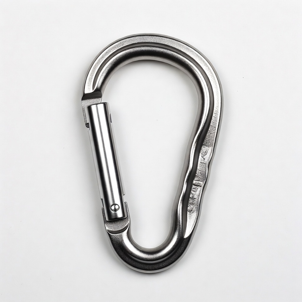 D-ring, carabiner clip, climbing gear, climbing hardware, hardware, heavy duty, isolated background, locking carabiner, metal hook, mountaineering equipment, outdoor gear, polished metal, safety clip, screw gate, shiny carabiner, silver carabiner, stainless steel, carabiner