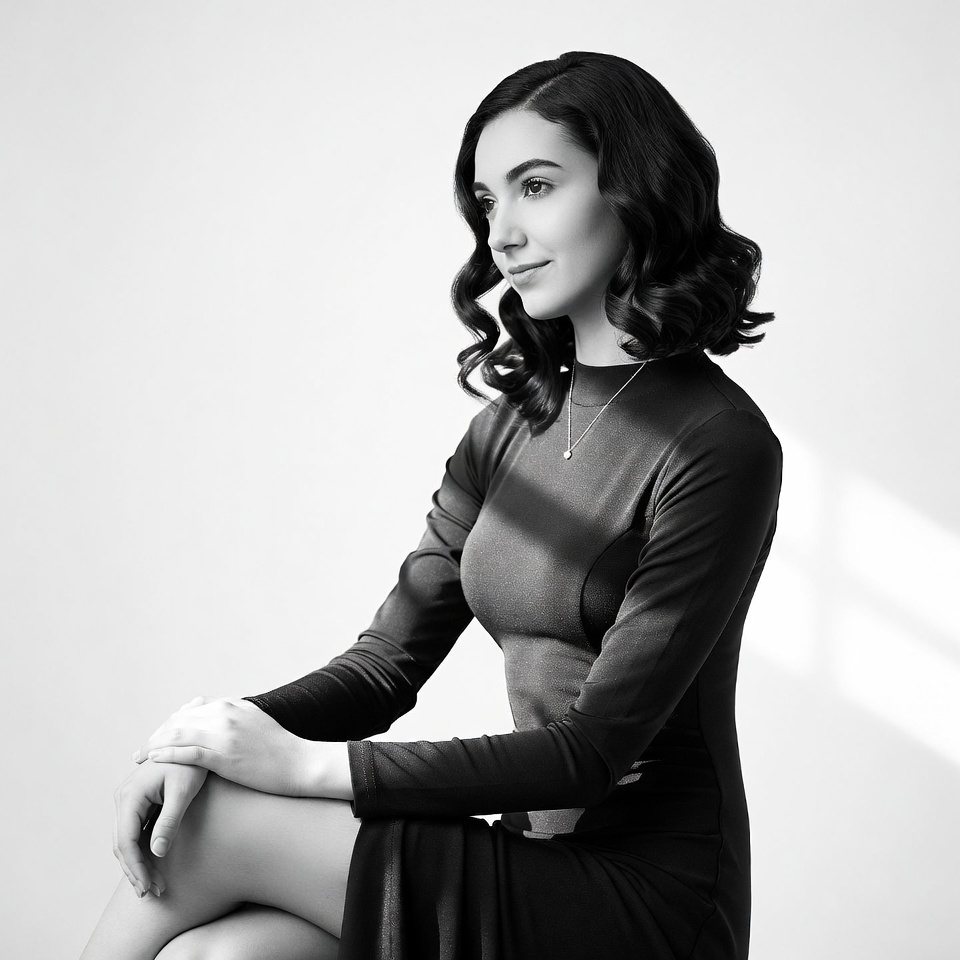 A young woman with wavy dark hair gazes to the side in a black and white portrait. She wears a form-fitting long-sleeved black dress with a necklace and sits with legs crossed against a plain white background. Soft light highlights her face and the fabric of her dress.