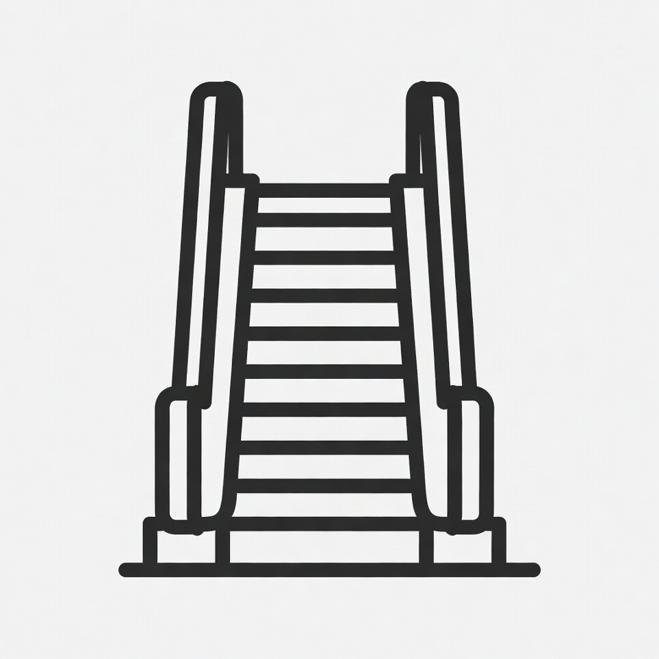 architecture, black lines, building, clipart, graphic, handrails, icon, illustration, isolated background, line art, monochrome, moving stairs, outline, simple, stairs, steps, symbol, transportation, upward, vector, escalator