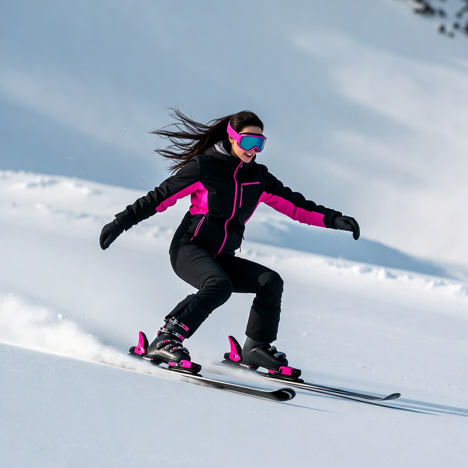 A woman with long dark hair in a ponytail wears pink-trimmed black ski gear and blue goggles while skiing down a snowy mountain slope. She is in a crouched position with arms extended for balance, kicking up snow behind her pink ski boots and skis. Her jacket and pants feature bright pink accents against the white snow-covered background.