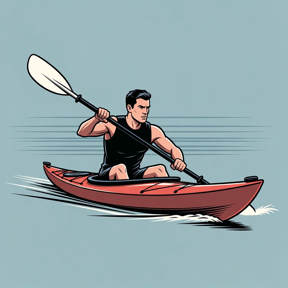 A muscular man with short dark hair paddles a red kayak on water in a vibrant illustration. He wears a black tank top and shorts, gripping a white paddle firmly. The kayak moves forward with water splashes, set against a light blue background.