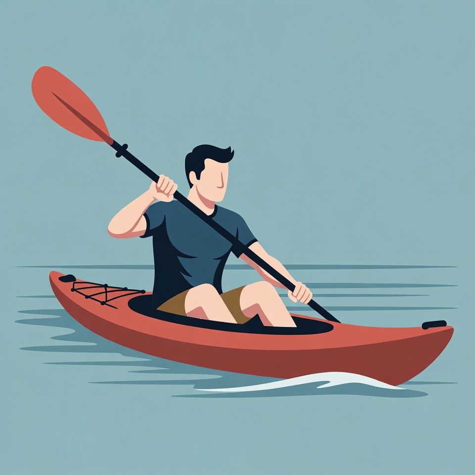 A man with short dark hair paddles a red kayak on calm blue water in a flat illustration style. He wears a dark t-shirt and shorts, gripping a paddle with both hands. The kayak glides forward with gentle waves behind it.