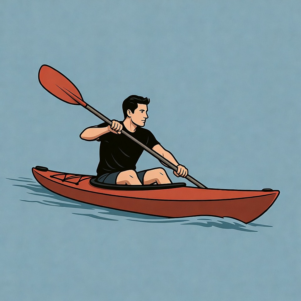 A cartoon illustration shows a young man with short dark hair paddling a red kayak on blue water. He wears a black t-shirt and shorts, gripping a paddle with red blades. The scene is viewed from a side angle against a light blue background.