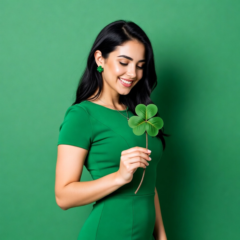 A smiling Latina woman with long black hair holds a four-leaf clover in her hand. She wears a form-fitting green dress and matching green earrings. She poses against a solid green background.