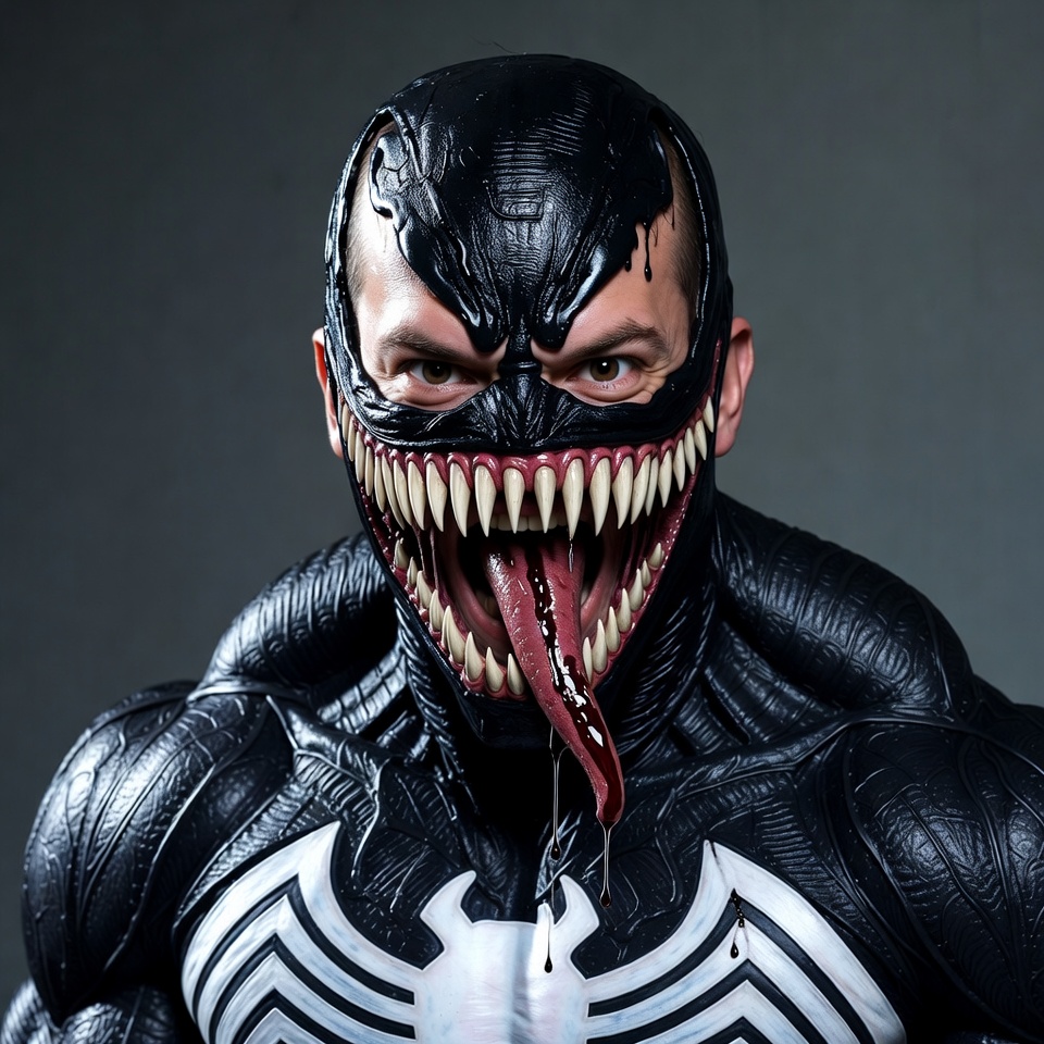 Marvel, White, black suit, cosplay, costume, detailed, extended tongue, fangs, glossy, isolated background, male, man, menacing, muscular, sharp teeth, superhero, symbiote, tongue, veins, villain, Venom