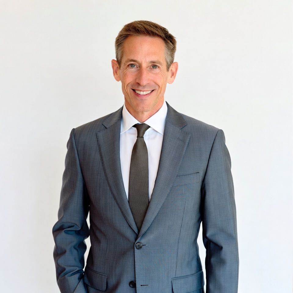 A middle-aged White man with short brown hair smiles confidently at the camera. He wears a gray pinstripe suit, white dress shirt, and dark tie, standing with hands in pockets. The image is set against a plain white background.