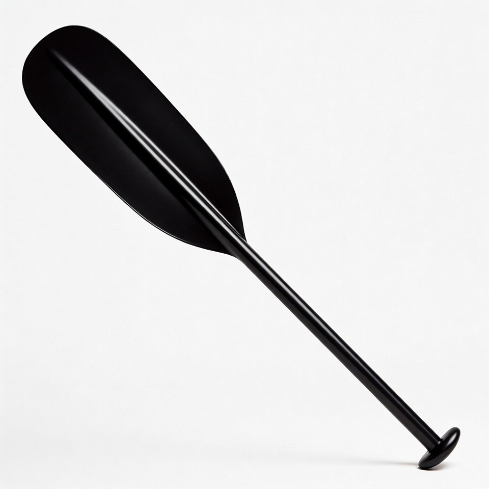 A black canoe paddle with a wide blade and long handle is positioned diagonally. It features a smooth, glossy finish and a rounded tip at the end of the handle. The paddle is isolated against a white background.