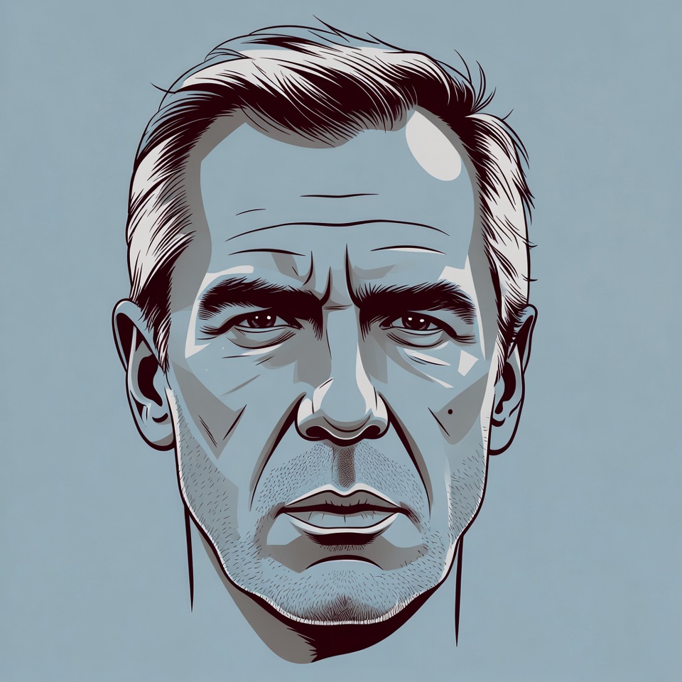 White, adult man, blue background, face, headshot, illustration, intense gaze, line art, male, mature man, piercing eyes, portrait, serious man, short hair, stern expression, strong jawline, vector art, white hair, man