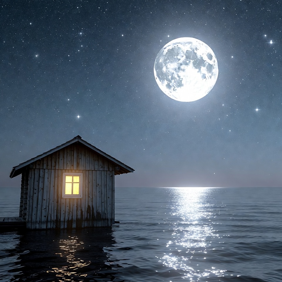 A small wooden cabin with a single lit window sits on a dock over calm water at night. A large full moon shines brightly in the starry sky, its reflection shimmering on the water's surface. The scene features a serene lakeside or seaside setting with gentle waves.