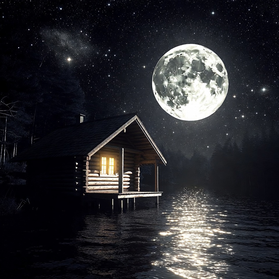 A cozy wooden log cabin sits on stilts over a calm lake at night. Warm light glows from its window, illuminating the dark forest surroundings. A large full moon shines brightly in the starry sky, reflecting on the water's surface.