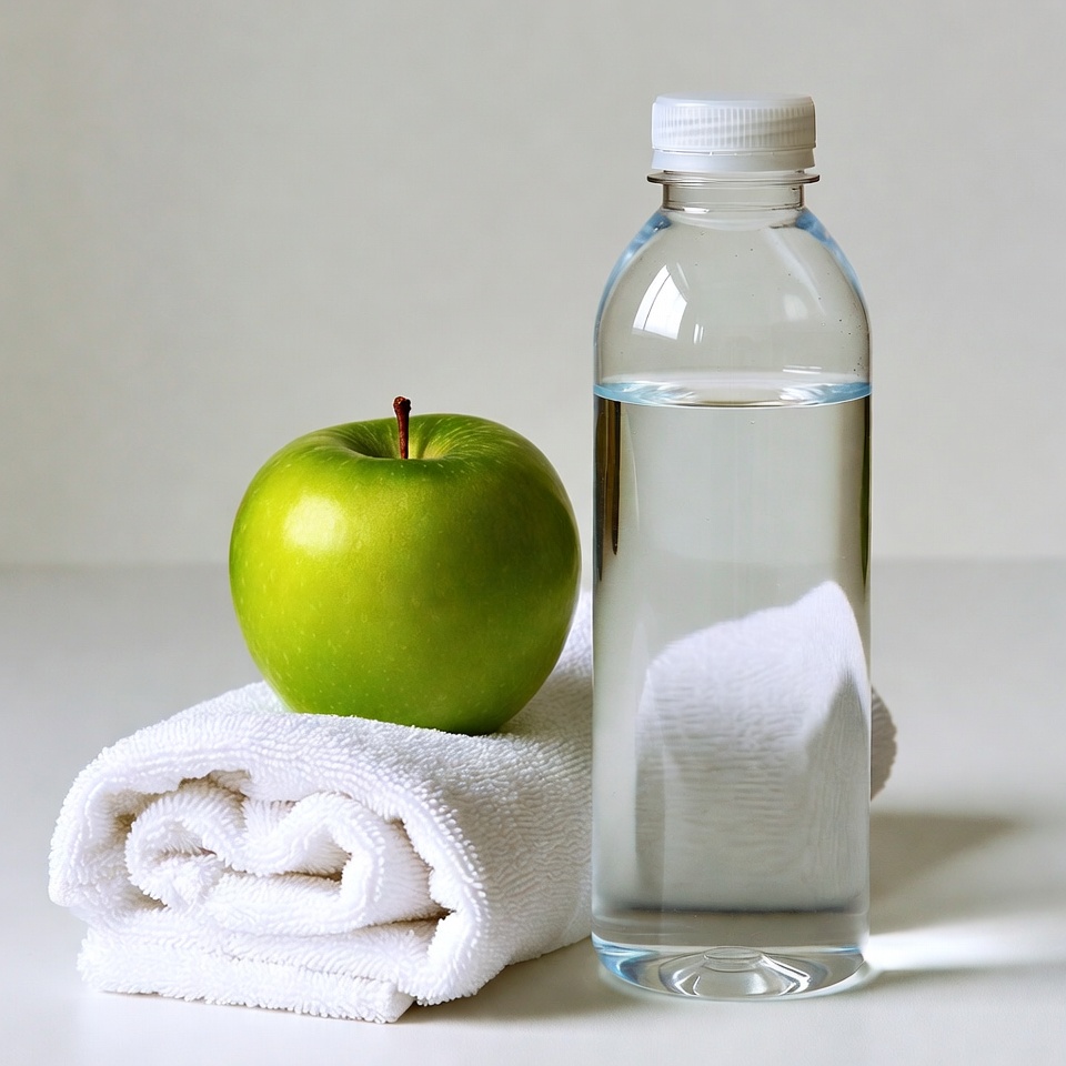 apple, bottle, bottled water, cap, diet, droplet, fitness, fresh fruit, fruit, gym accessories, healthy food, hydration, isolated, nutrition, plastic bottle, refreshment, stem, still life, towel, water bottle, wellness, white background, white towel, green apple