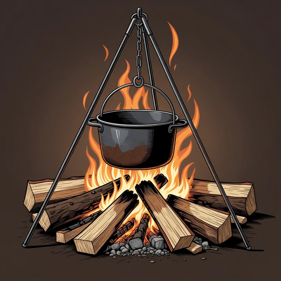 A black pot hangs from chains on a metal tripod over a roaring campfire. The fire consists of stacked logs and flames illuminating the scene. The illustration features a dark background with glowing embers.