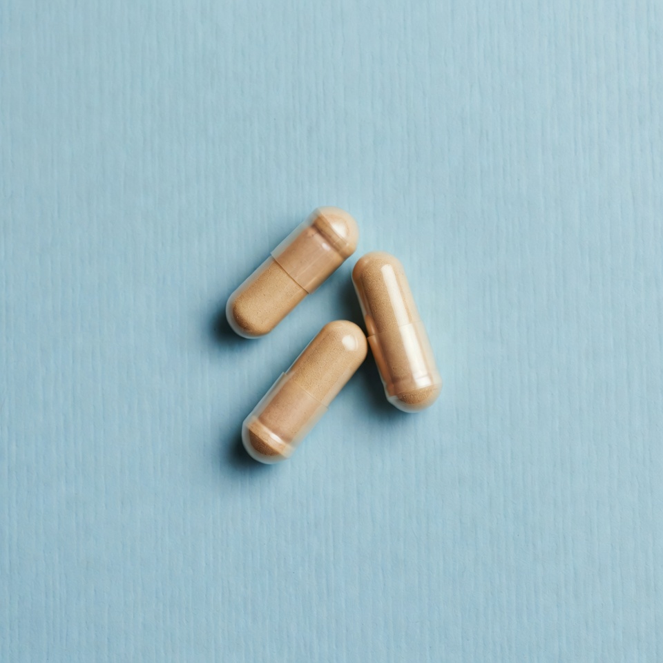 Three beige capsules on blue background