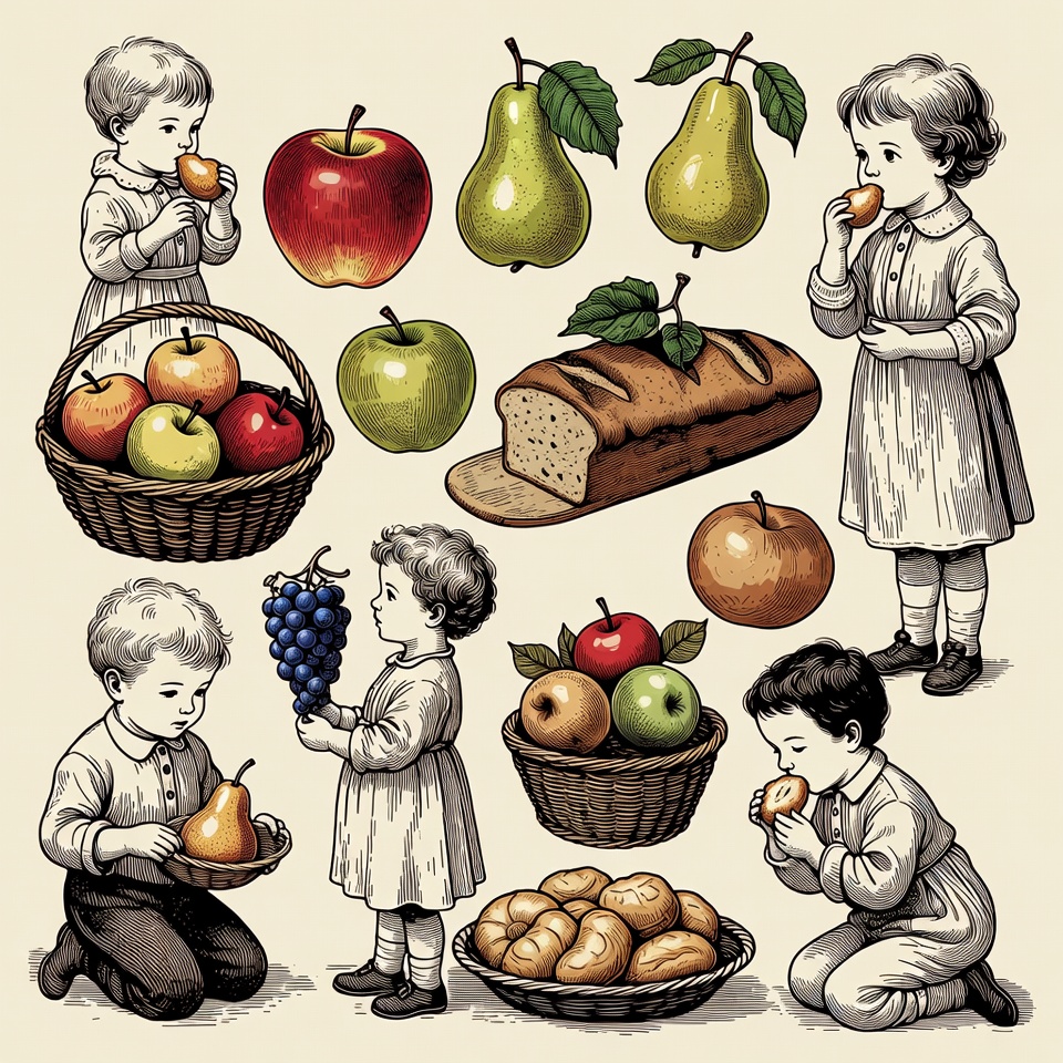 Vintage-style line art illustration depicts young children in white period clothing interacting with fresh fruits and bread. A boy and girl eat apples, another boy holds grapes, a girl sniffs a pear, and a kneeling boy eats bread near baskets of apples, pears, grapes, and buns. The children are arranged around scattered produce on a plain background.